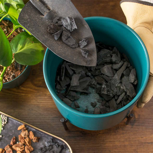 Charcoal can be spread over near the base of plants or can be added to the soil while planting it. It can either be used as big chunks or can be crushed into small pieces or powder.