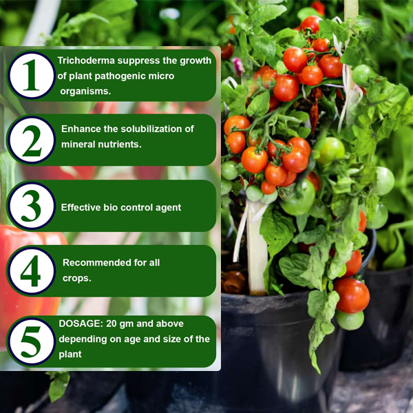 Trichoderma eco-friendly bio-fungicide refers to a type of bio-fungicide derived from the beneficial fungus Trichoderma. Trichoderma species are commonly used in agriculture and gardening as biological control agents against various plant pathogens. These bio-fungicides work by colonizing the root zone of plants and inhibiting the growth of harmful fungi through competition for nutrients and space, parasitism, and the production of antifungal compounds.
